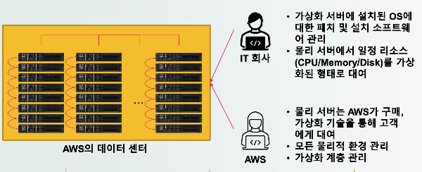 - 물리 서버는 AWS가 구매 및 관리하고 가상화 기술을 통해서 웹상에서 고객에게 대여할 수 있는 서비스를 제공한다. 이와 관련된 물리적 환경과 가상화 계층은 모두 AWS가 관리한다.