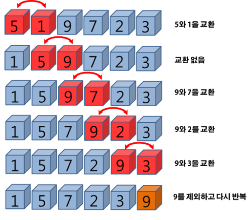 리스트를 반복적으로 순회하며, 각 순회에서 인접한 두원소를 비교하여 교환