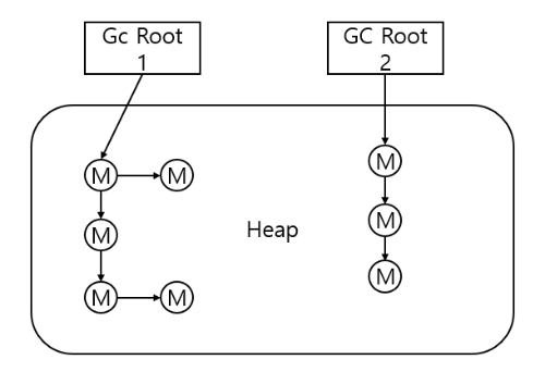 GC Root에서 시작해 GC Root가 참조하는 모든 오브젝트, 그 오브젝트들이 참조하는 다른 오브젝트들을