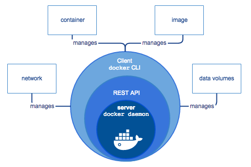 RESTful API등 도구들이 클라이언트가 되어서 도커 데몬에게 작업을 지시합니다.