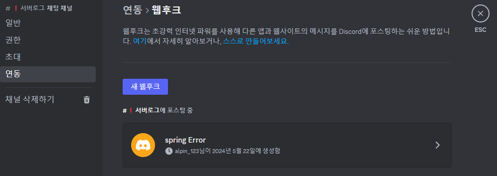 이후 자체적으로 오류 발생시켜 디스코드 채팅 채널에 로그가 오는지 확인하기