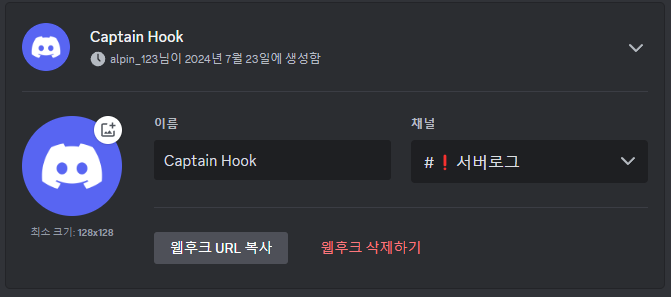 생성된 웹후크를 눌러 이름 및 알림이 뿌려질 채널이 맞는지 설정을 해준뒤
